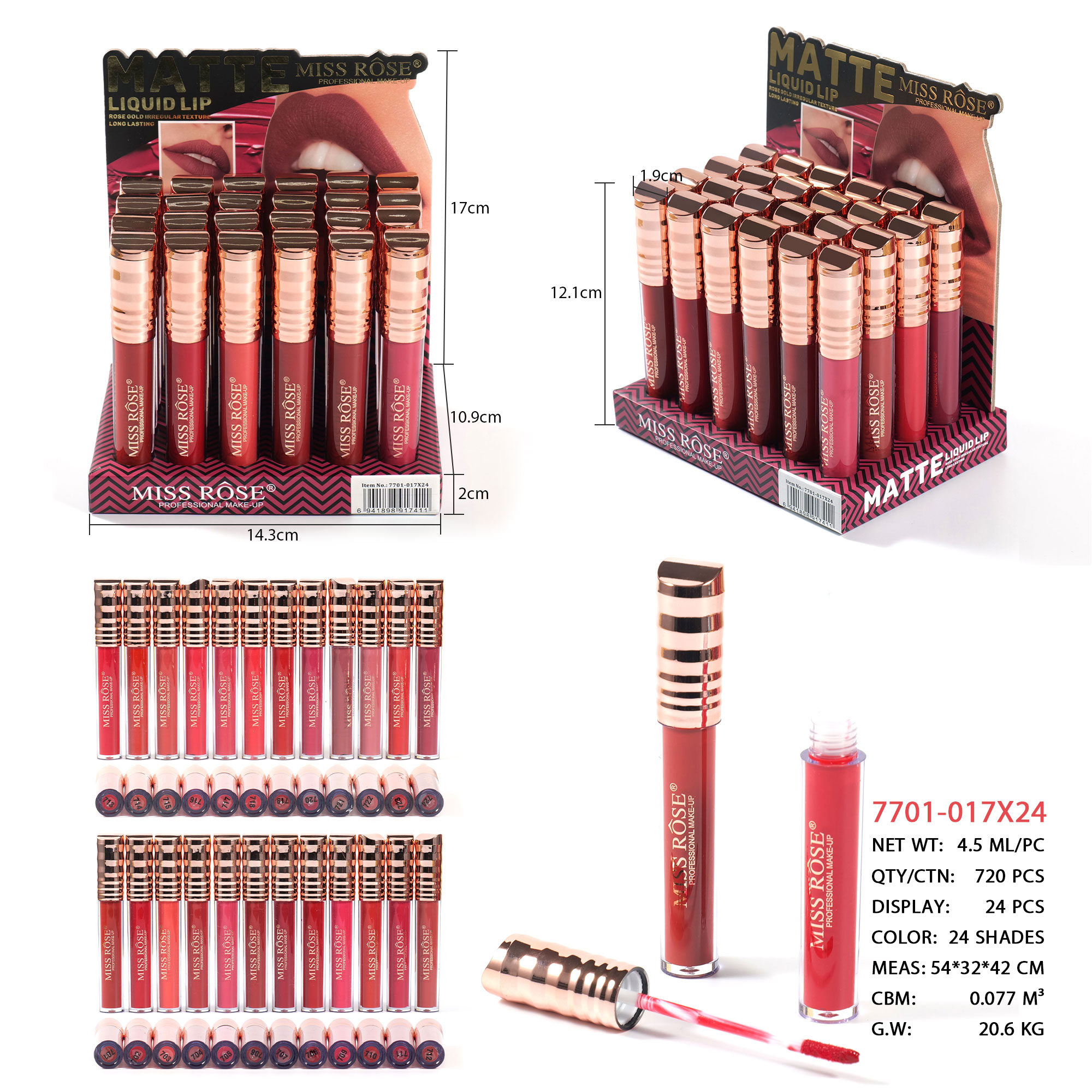 7701-017X24 Matte lip gloss 24 color sets, 24 display boxes